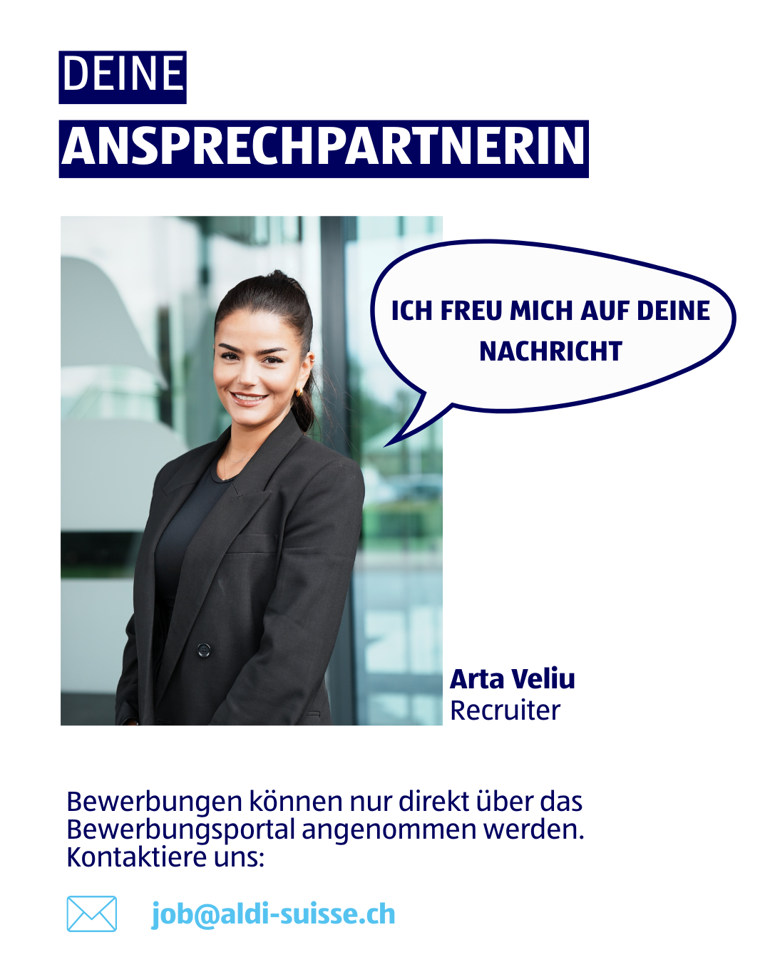 Unser Recruiting-Team schafft den Rahmen, in dem Talente erkannt, gefördert und langfristig begleitet werden. Vom ersten Kontakt bis zur individuellen Weiterentwicklung stehen wir mit Engagement, Klarheit und Wertschätzung zur Seite. Denn wir sind überzeugt: Eine starke Unternehmenskultur beginnt mit einem starken Miteinander. Unsere Arbeit basiert auf den Werten, die auch ALDI SUISSE als Arbeitgeber auszeichnen: Einfachheit, Verantwortung und Verlässlichkeit. Diese Grundsätze prägen nicht nur unsere Prozesse, sondern auch den Umgang miteinander. Wir setzen auf klare Kommunikation, transparente Abläufe und ein unterstützendes Miteinander. Wir freuen uns darauf, dich kennenzulernen.